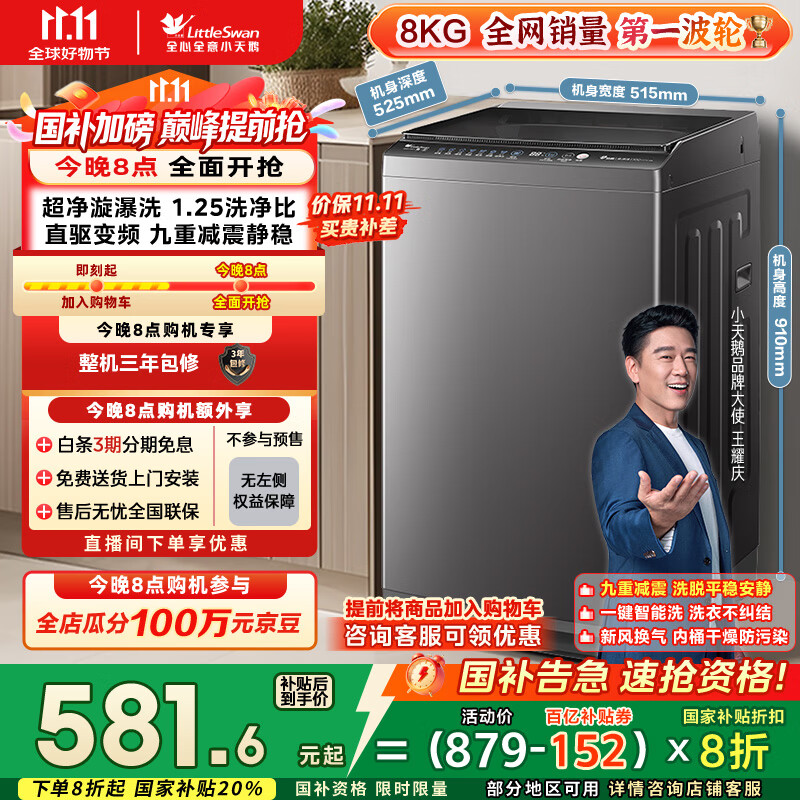 小天鹅(LittleSwan)波轮洗衣机全自动 8公斤 一级能效 除菌螨 家电国家补贴20% 【TB80V26DT】 宿舍租房神器 以旧换新