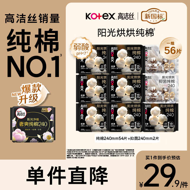 高洁丝(Kotex)卫生巾阳光烘烘臻选纯棉姨妈巾日用夜周期套装柔软亲肤透气 日用240组合50片+6片