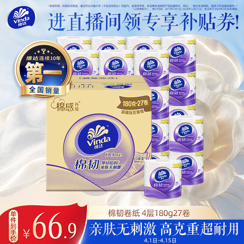 维达(Vinda)有芯卷纸 棉韧4层180克*27卷 卫生纸 大分量卷筒纸 整箱