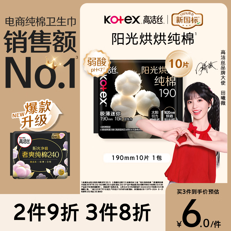 高洁丝【纯棉NO.1】阳光烘烘卫生巾190mm10片日用护垫迷你巾京东自营
