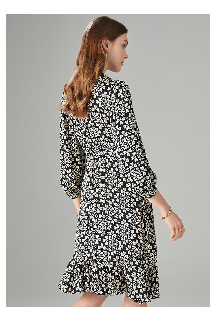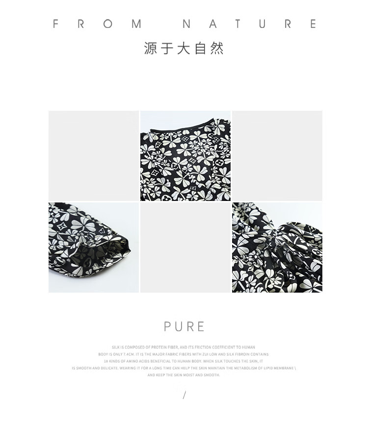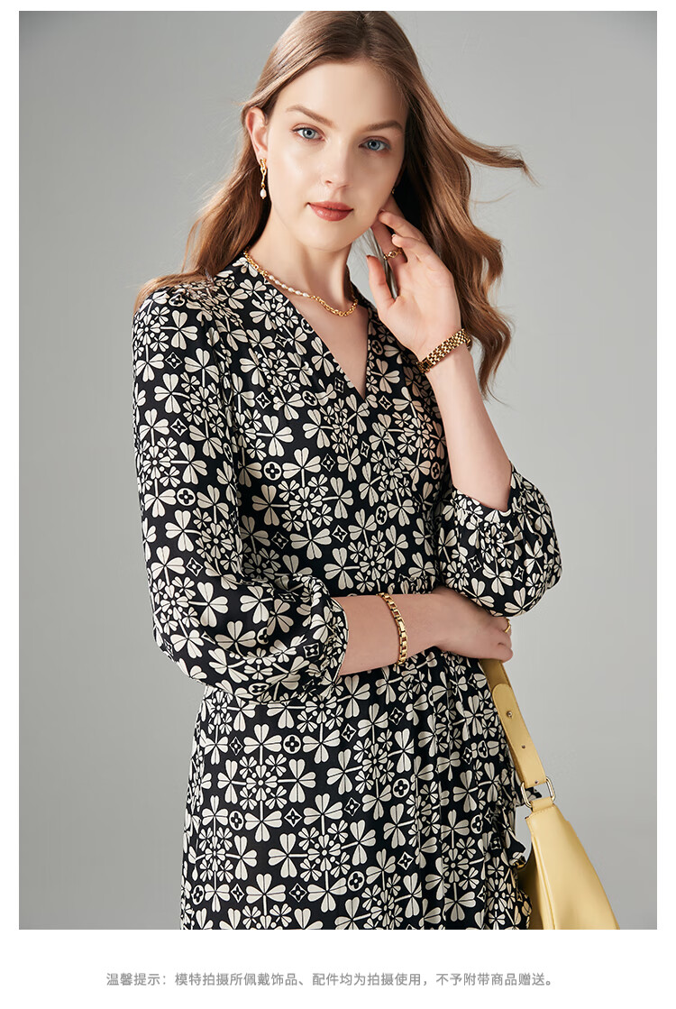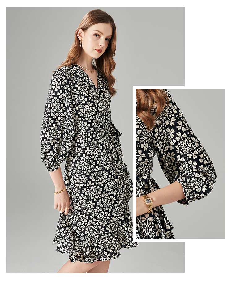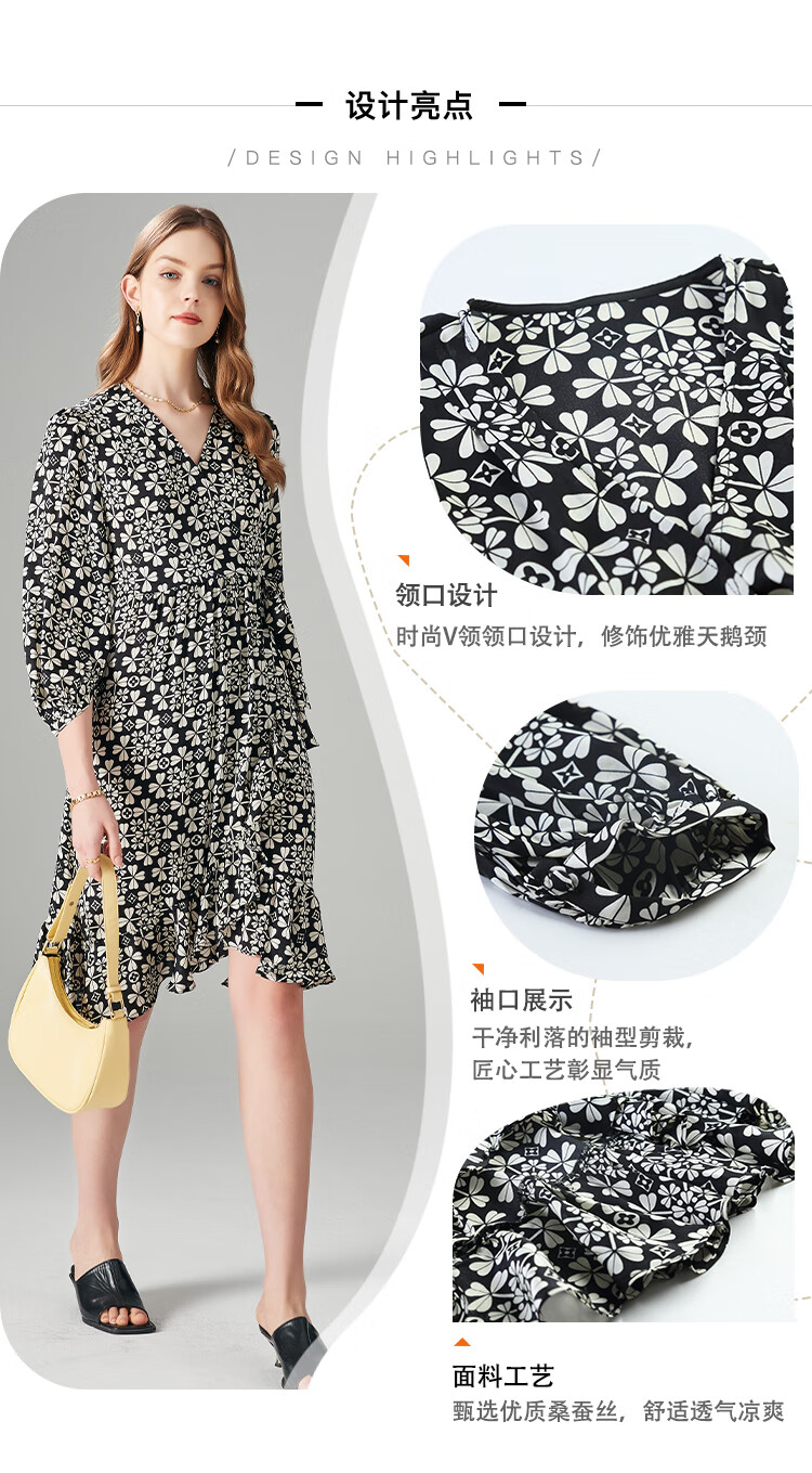 帕罗(PALUOPO)夏真丝碎花法式连衣裙桑蚕丝女士五分袖收腰中长裙 黑色 L (165/88A)