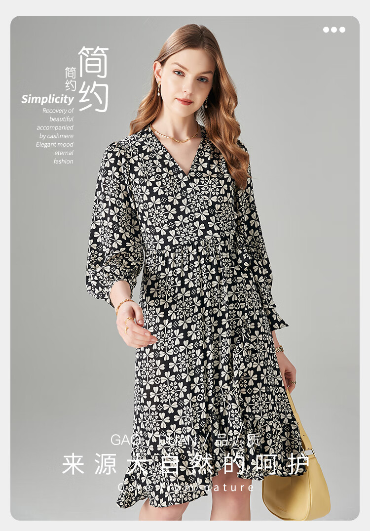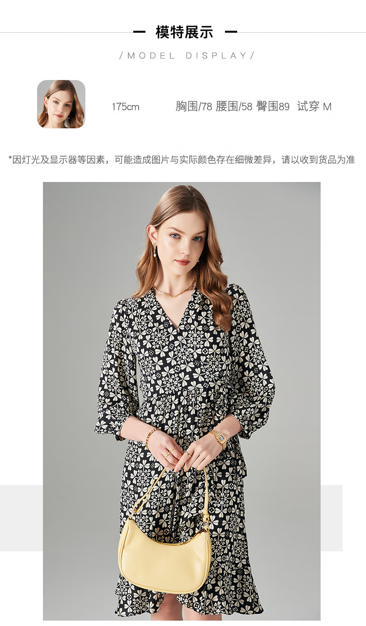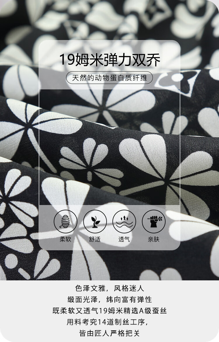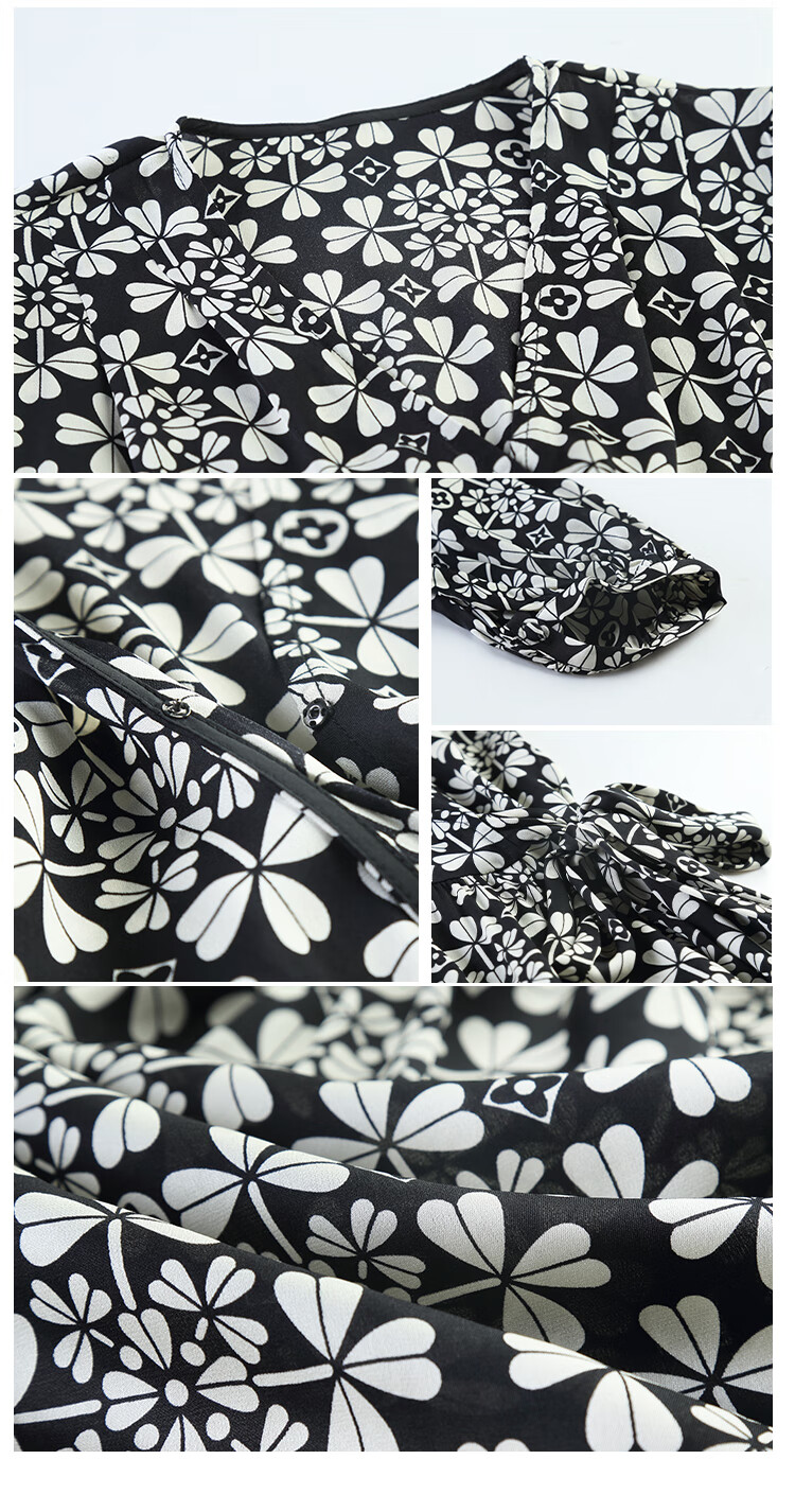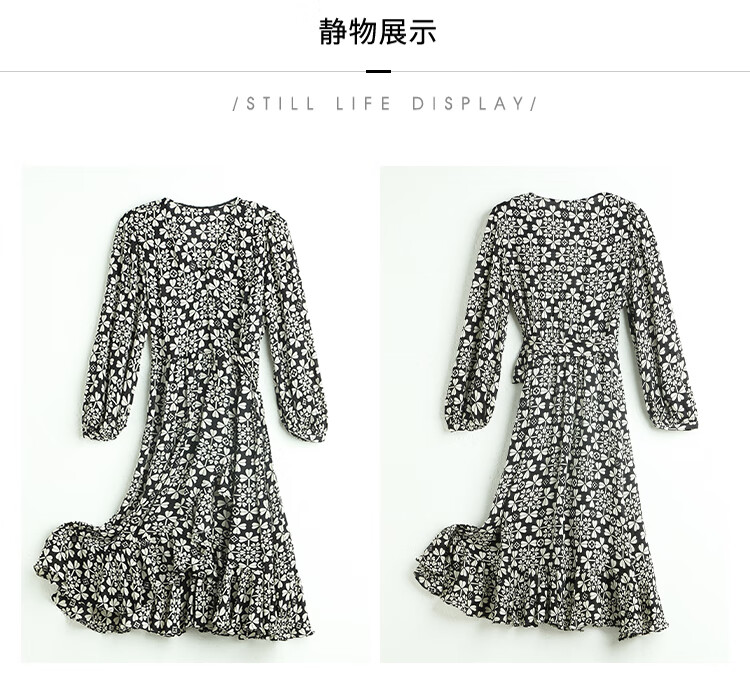 帕罗(PALUOPO)夏真丝碎花法式连衣裙桑蚕丝女士五分袖收腰中长裙 黑色 L (165/88A)