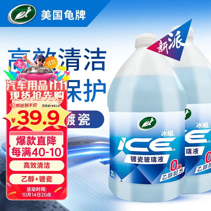 龟牌(Turtle Wax)冰蜡玻璃水镀瓷乙醇0°去油膜汽车特斯拉宝马奔驰除虫胶雨刮水2瓶